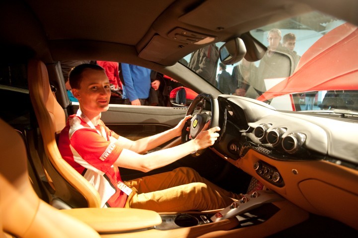 From there we visited a Ferrari road car showroom where we tried the cockpits of several spectacular super cars. We started with the FF, California, F458 Italia Spider and then the brand new F12 Berlinetta. Each one was very comfortable and it was very easy to imagine yourself driving one on the road… if money was no object! The material finish was incredible – everything covered in leather, alcantara and carbon fibre. Care had been taken to make every switch and button feel just right. Personally, I didn’t care for the driving position in the F12 but I loved all of the other cars.